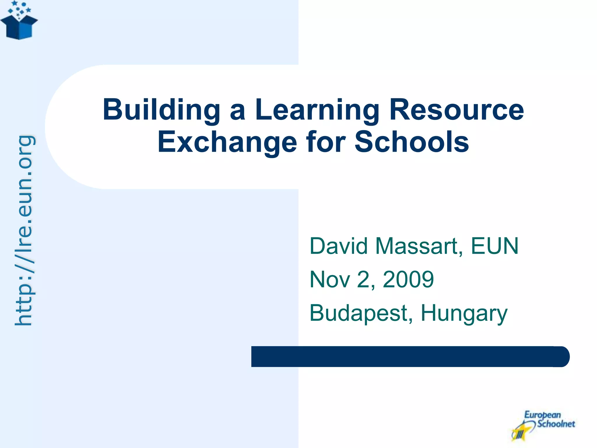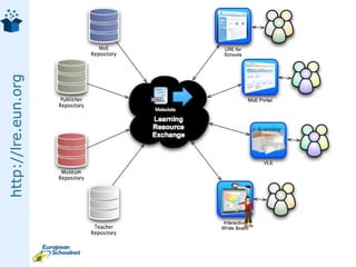 The document discusses the European Schoolnet's (EUN) efforts to build a Learning Resource Exchange (LRE) to improve access and reuse of educational content across Europe. It provides an overview of several related projects undertaken by EUN since 2002 to develop the LRE, including the CELEBRATE, CALIBRATE, and MELT projects. It describes the vision and goals of the LRE, which aims to federate educational content repositories across Europe through common technical and semantic standards to allow for interoperability and discovery of resources. The ASPECT project, launched in 2008, continues this work by assessing standards implementation and developing best practices for content exchange.