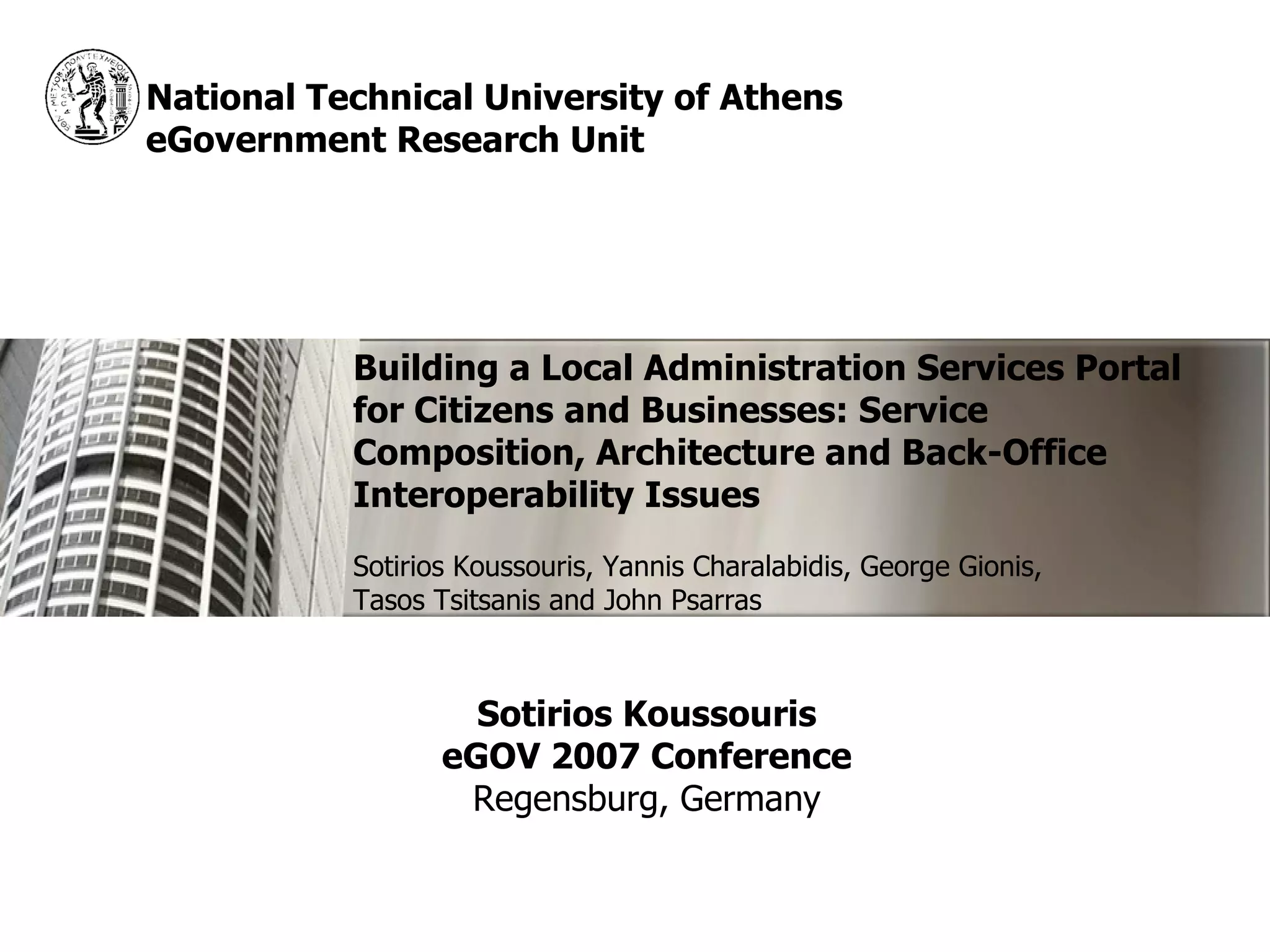 The document discusses the development of a local administration services portal aimed at improving e-government systems for citizens and businesses, highlighting service composition, architecture, and interoperability issues. It outlines the methodology for designing these portals, including service analysis, data modeling, and prioritization of services based on their impact. Initial implementations in Greek municipalities have shown positive results, emphasizing the need for standards and interoperability in e-government services.