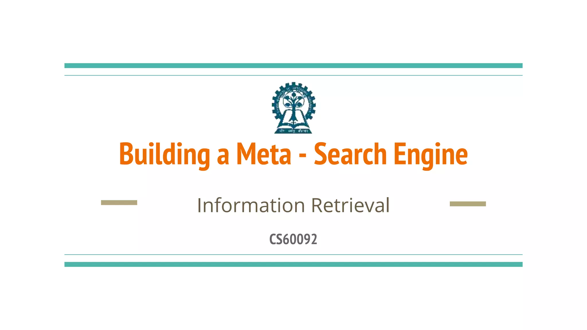 The document describes building a meta-search engine that aggregates results from multiple search engines. It discusses the infrastructure including querying different search engines simultaneously, preprocessing queries, caching results, and using multithreading. It also covers re-ranking and aggregating results using methods like alpha-majority and analyzing query logs and system performance. Evaluation shows highest mean average precision for queries related to news, trending topics, and video keywords.