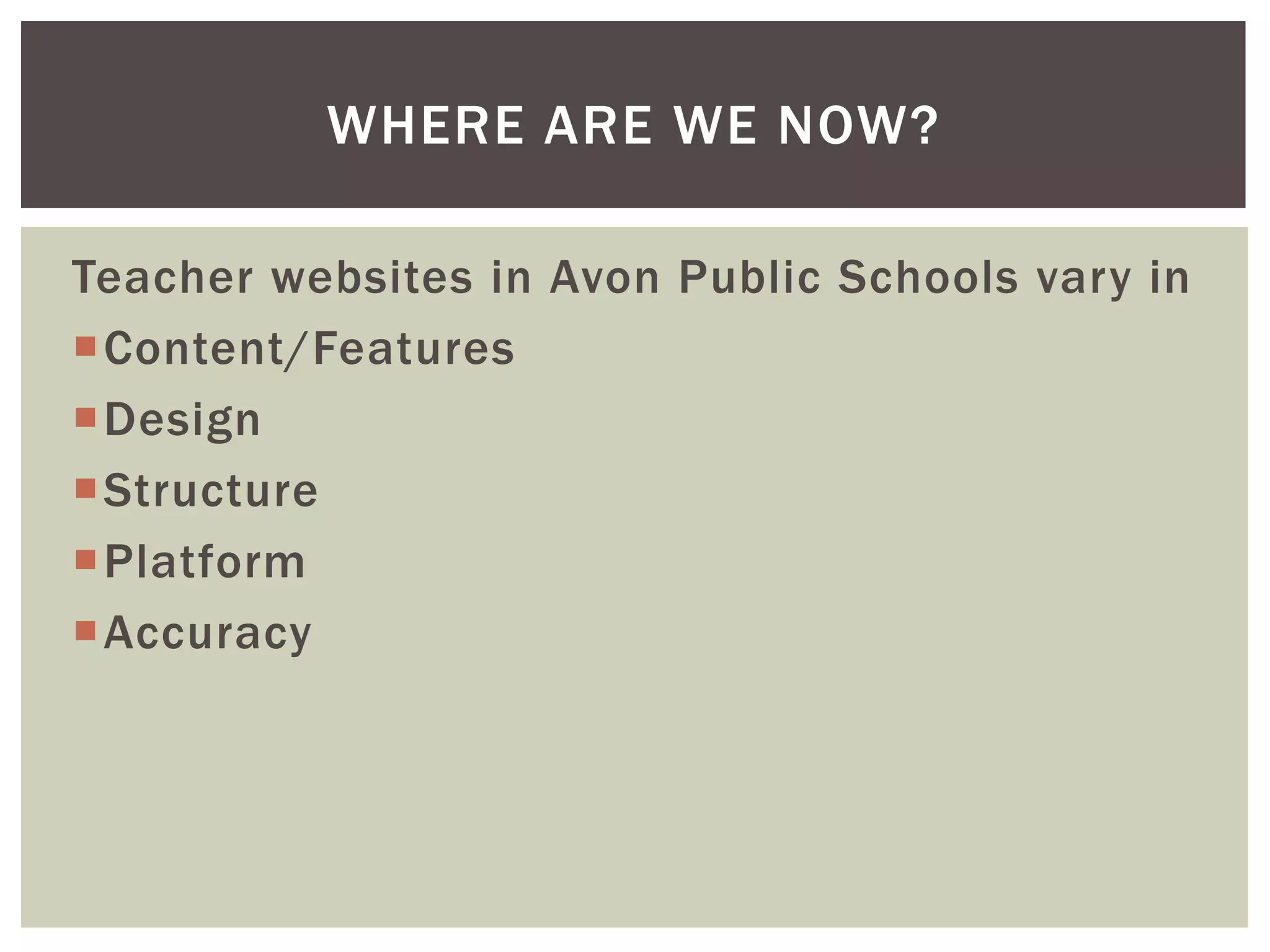 The document discusses the need for a unified platform for teacher websites within Avon Public Schools, highlighting the inconsistency and outdated content currently present. It outlines requirements for the platform, including cost-effectiveness, design uniformity, and flexibility to cater to various teachers' needs. Additionally, it provides a roadmap for setting up and managing these sites, emphasizing the importance of user permissions and training.