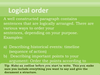 The document discusses key aspects of writing a well-constructed paragraph: considering logical order, linking sentences, repeating key words, and relevance. A good paragraph arranges sentences and ideas in a logical flow, uses linking words to connect ideas clearly, avoids overusing key words by finding synonyms, and ensures all sentences are relevant to the main topic.