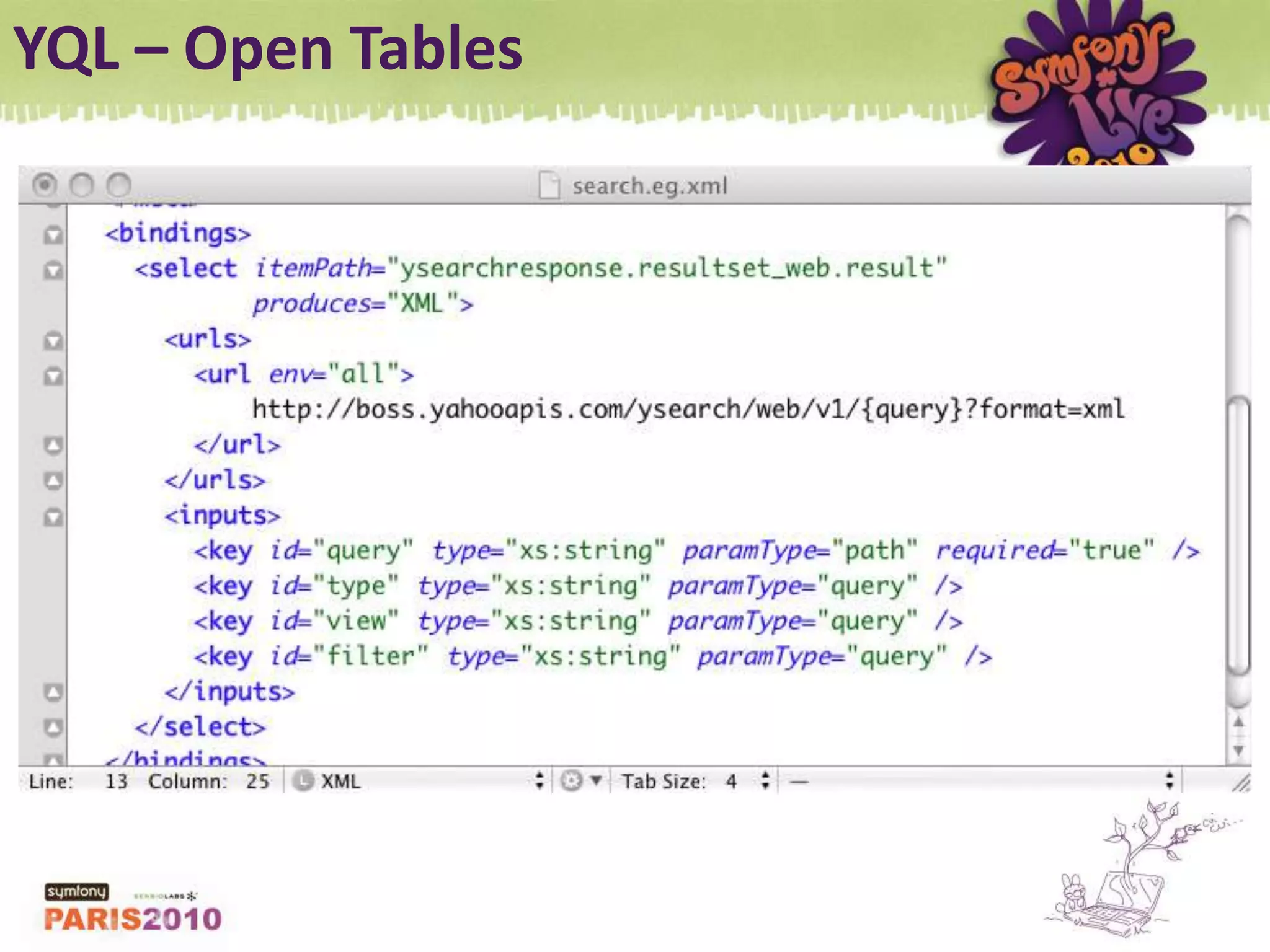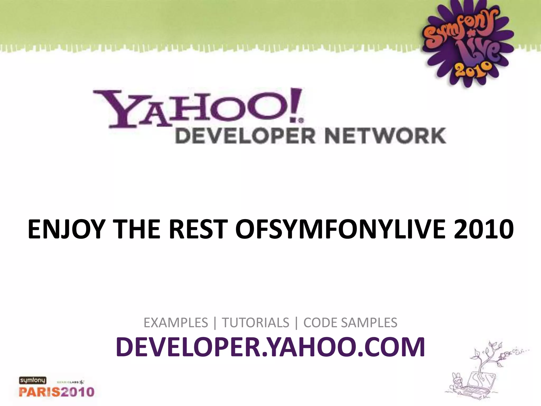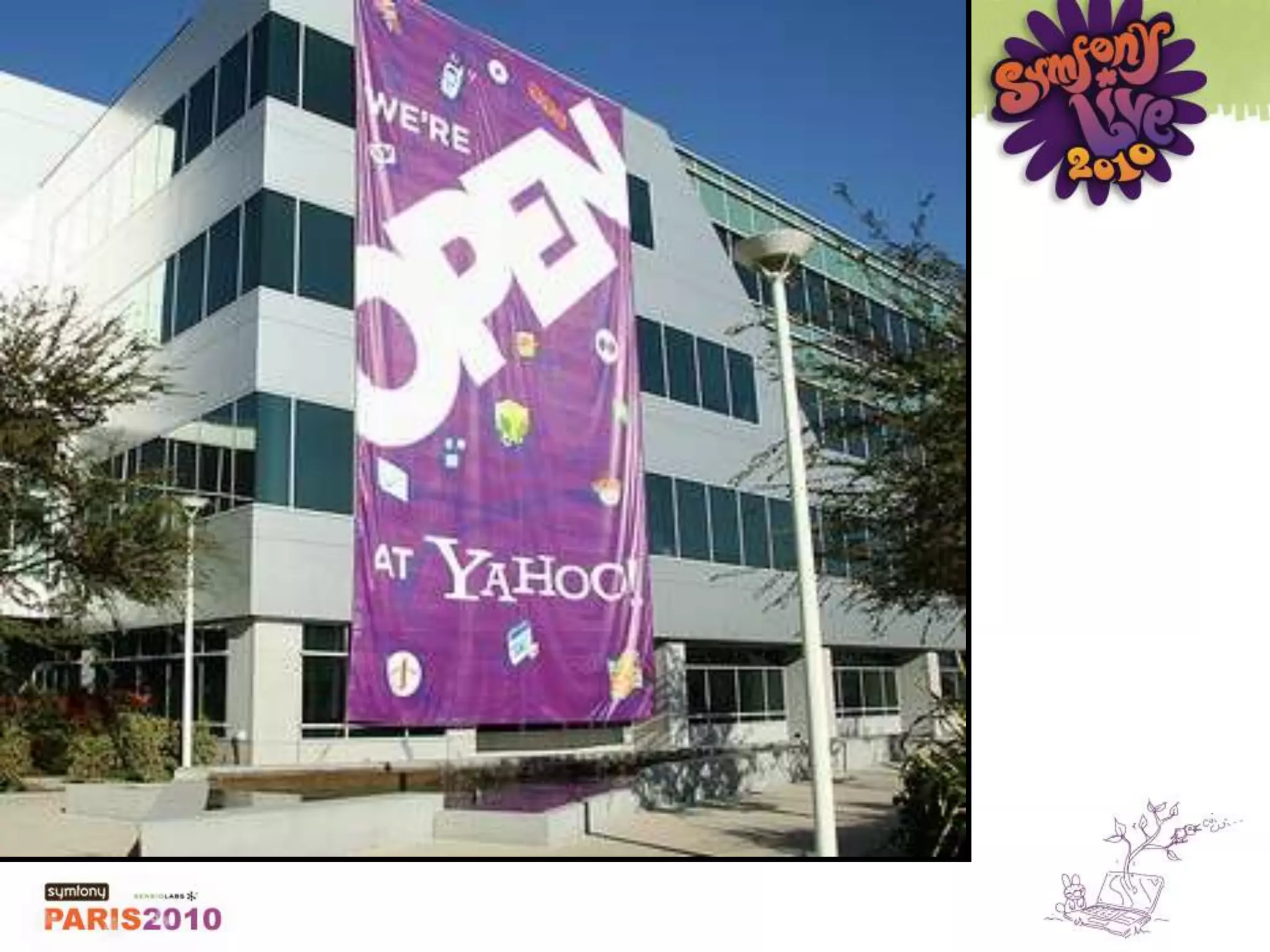 The document discusses Yahoo!'s strategy for building web applications using the Symfony framework, emphasizing the benefits of open source technologies and the importance of scalability, maintainability, and performance. It highlights Yahoo!'s adoption of Symfony for various services and projects, including Yahoo! Answers, while advocating for a modular approach to development and the use of components tailored to specific needs. The document also details the integration of Yahoo!'s developer tools and APIs, such as YQL (Yahoo! Query Language), aimed at facilitating developers in building applications and accessing web data.