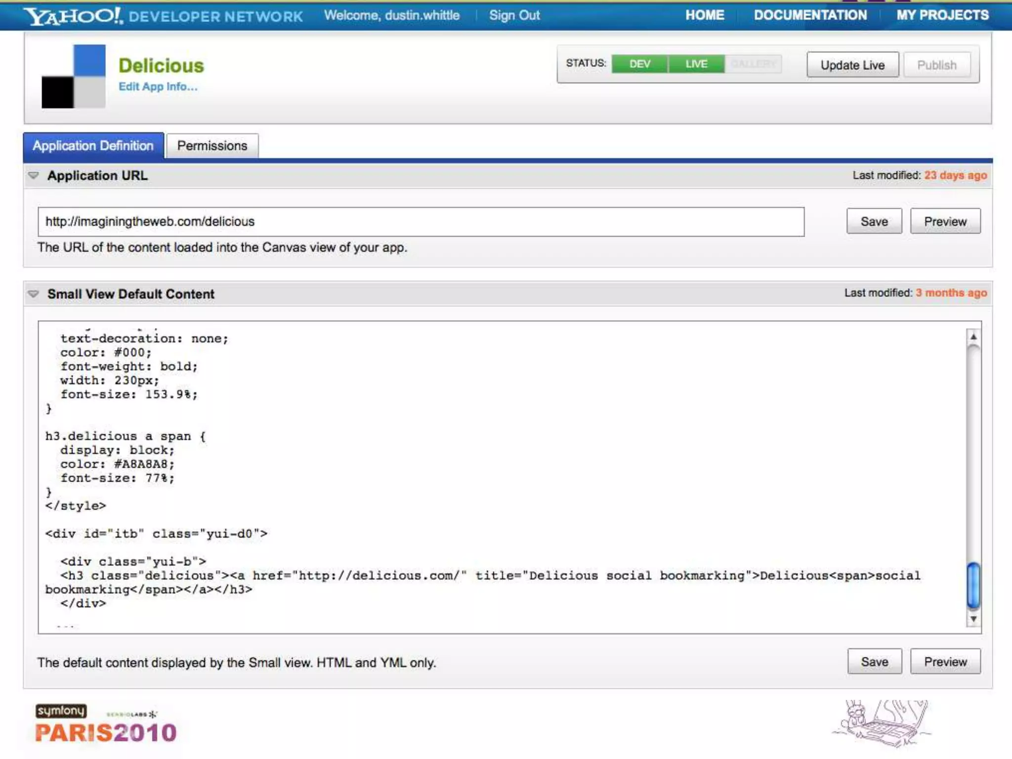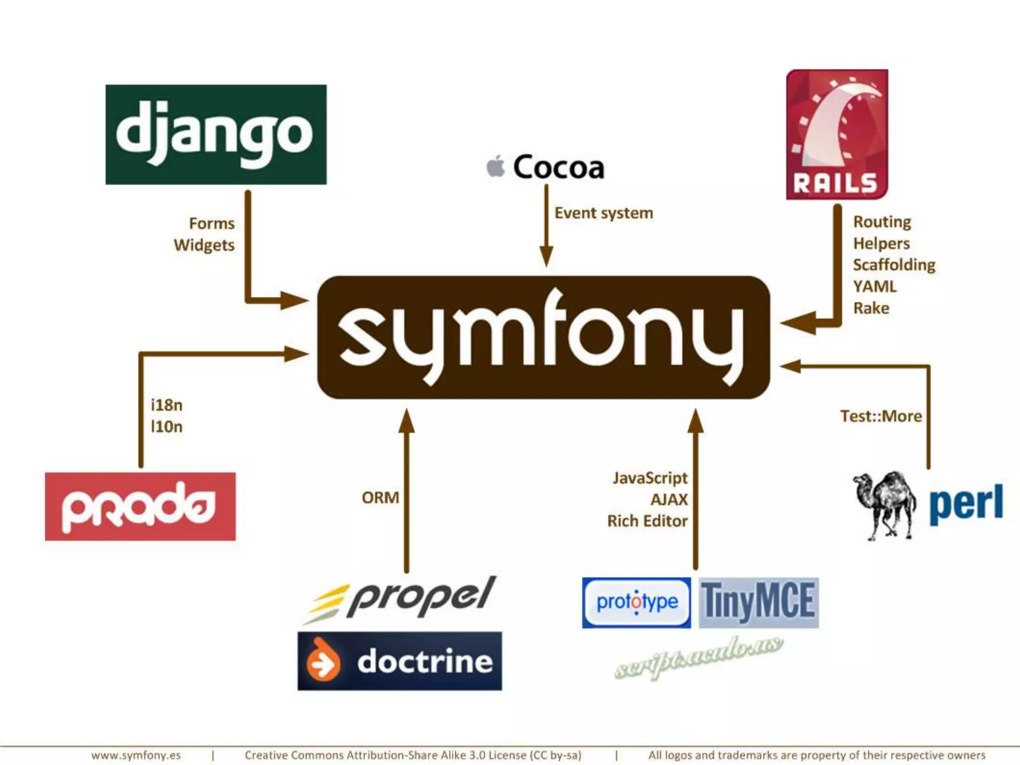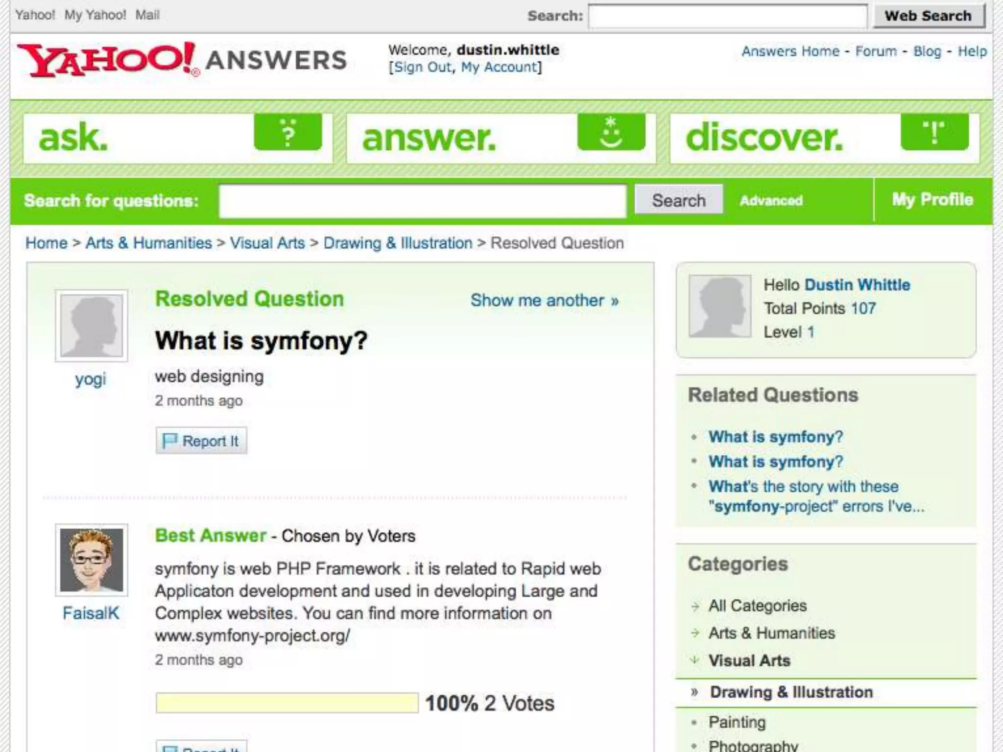 The document discusses Yahoo!'s strategy for building web applications using the Symfony framework, emphasizing the benefits of open source technologies and the importance of scalability, maintainability, and performance. It highlights Yahoo!'s adoption of Symfony for various services and projects, including Yahoo! Answers, while advocating for a modular approach to development and the use of components tailored to specific needs. The document also details the integration of Yahoo!'s developer tools and APIs, such as YQL (Yahoo! Query Language), aimed at facilitating developers in building applications and accessing web data.
