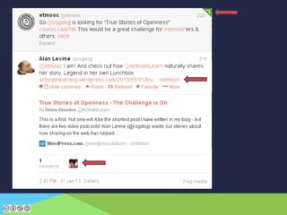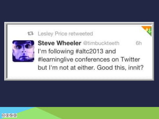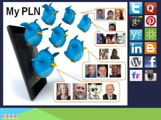 The document discusses building a personal learning network (PLN) using Twitter. It defines a PLN as a group that can guide learning and provide knowledge and experience. Activities are suggested to get participants to explore building their PLN on Twitter by following others, participating in discussions with hashtags, and learning how to use features like retweets and mentions. The value of PLNs is that they support professional development and role requirements through ongoing learning opportunities and knowledge sharing.