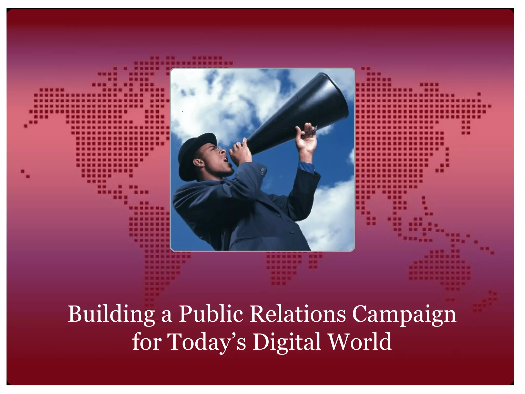 The document discusses how to build an effective public relations campaign for today's digital world. It outlines traditional PR tactics and how the landscape has changed with new social media platforms and tools. An integrated campaign is recommended that utilizes both traditional and digital/social media channels to target the right audiences and measure results.