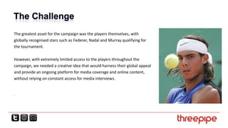Threepipe is an award-winning PR and social media agency that has grown to 25 employees since launching in 2004. They develop integrated campaigns for consumer, sports, lifestyle and corporate clients. Their tactics include creative competitions, partnerships with celebrities and charities, and leveraging events for media coverage. They summarize a bullying prevention campaign for Vodafone that engaged teenagers through a Joseph and the Amazing Technicolor Dreamcoat design competition and raised over £25,000.