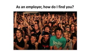This document provides guidance on building a professional digital profile. It discusses digital literacies and their importance for employment prospects. Managing personal and professional identities online is important, as employers increasingly use social media in hiring. The document offers tips on developing an online presence through platforms like LinkedIn and curating a digital footprint that showcases skills. It emphasizes giving value to one's network through sharing and engaging before asking for recommendations or help. Maintaining privacy and securing accounts is also advised. Exercises encourage readers to reflect on their digital identity management and plans to enhance their online professional profile.
