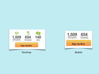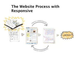 This document discusses responsive web design and how it changes the design process. It recommends prioritizing content and identifying content chunks when designing for different screen sizes. Designers should decide on breakpoints and create grid templates for different device widths. The process involves wireframing and designing for both desktop and mobile simultaneously through iteration. Effective collaboration between designers and developers is important when screen sizes are considered.