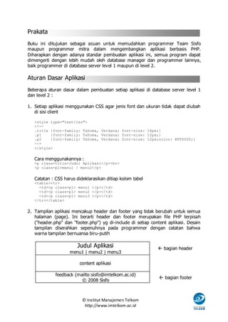 Dokumen ini memberikan standar pembuatan aplikasi berbasis PHP dan MySQL untuk programmer di Institut Manajemen Telkom, mencakup aturan dasar, aspek keamanan, dan pengelolaan database. Ditekankan pentingnya penggunaan CSS, pengaturan koneksi, dan perlindungan terhadap SQL injection serta brute force attack. Selain itu, dinyatakan bahwa struktur database harus efisien dan sesuai dengan peruntukannya untuk mendukung kinerja sistem.