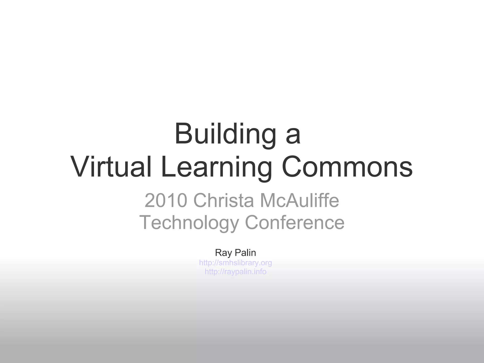 The document discusses building a virtual learning commons (VLC) to complement a physical learning commons. It provides examples of VLC features like research guides, citation makers, presentation tools, calendars, blogs, polls and social media connections that can help students with research and content creation. Effective VLCs prioritize information resources, make research processes clear, and provide help features like tutorials. The goal is an ongoing effort to connect users to information and tools in an interactive, collaborative way that facilitates learning.