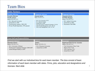 The document outlines the process for a wealth management team to develop a profile that introduces themselves to clients and prospects. It includes creating bios for each team member, defining roles and responsibilities, identifying any gaps in services, and establishing centers of expertise either within or outside of the team. It also describes developing a consultative process through repetitive discovery meetings, investment plan presentations, and mutual commitment meetings to engage clients over time. The goal is to clearly define what the team does and how they do it to effectively serve clients.