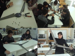 The document describes the process of making wind turbine blades out of PVC pipe. It explains how to quarter the pipe into four equal sections to make blades. It also discusses attaching the blades to a hub and mounting a 30V motor that acts as a generator when spun by the wind. Finally, it mentions using a wooden mount, aluminum tail, and iron pipe tower to support the turbine head unit above the ground.