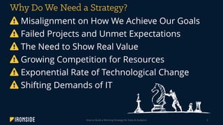The document outlines a comprehensive strategy for building effective data and analytics practices, emphasizing the need for alignment with business goals and the importance of governance. It discusses various approaches, including a decision-making framework, current state assessment, role enhancements, and the integration of design thinking. Key considerations include understanding data requirements, running effective experiments, and ensuring organizational readiness for change.