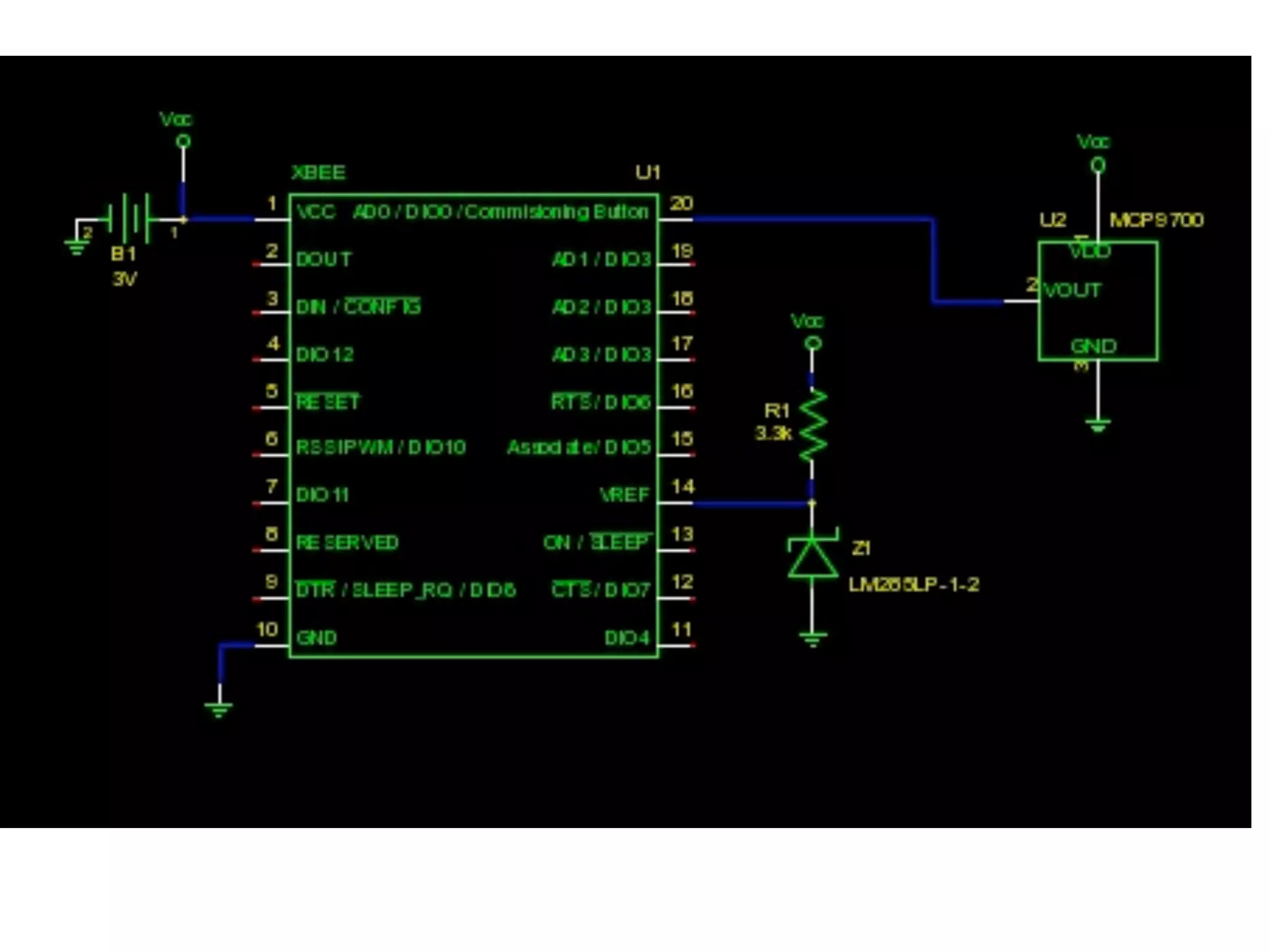 1) XBee modules with integrated ADCs connect temperature sensors to a central control system wirelessly.