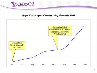 The document outlines a presentation by Jeffrey McManus on building web applications using Yahoo! web services, detailing various APIs and support for developers. It emphasizes Yahoo!'s goals of fostering a developer ecosystem, showcasing tools and services like web search, maps, music, shopping, and more while encouraging community engagement. Upcoming features include new APIs for calendar and photo services, highlighting Yahoo!'s focus on personalization and secure data access for users.