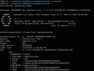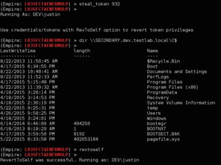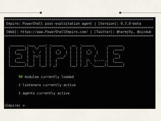 The document discusses PowerShell Empire, a PowerShell post-exploitation framework that aims to provide a flexible and extensible platform for integrating offensive PowerShell capabilities. It provides an overview of Empire's architecture, including its client-server design with a backend database, listeners for command and control, and modules for additional functionality. The document demonstrates Empire's capabilities through modules for process injection, privilege escalation, credential dumping, and lateral movement. It also discusses considerations for detecting and analyzing Empire agents on compromised systems.