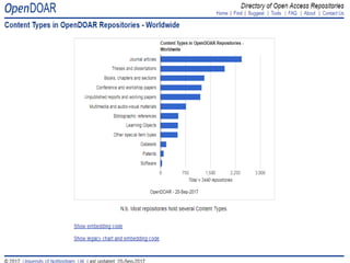 This document provides an introduction to institutional repositories and DSpace. It discusses what an institutional repository is, the types of content it contains from a university community, and important elements like being institutionally defined, scholarly, cumulative, open and interoperable. It covers implementing a repository by developing policies, metadata, permissions, and submission guidelines. The roles and software required are also outlined, with DSpace being the most commonly used software. Metadata standards like Dublin Core are explained.