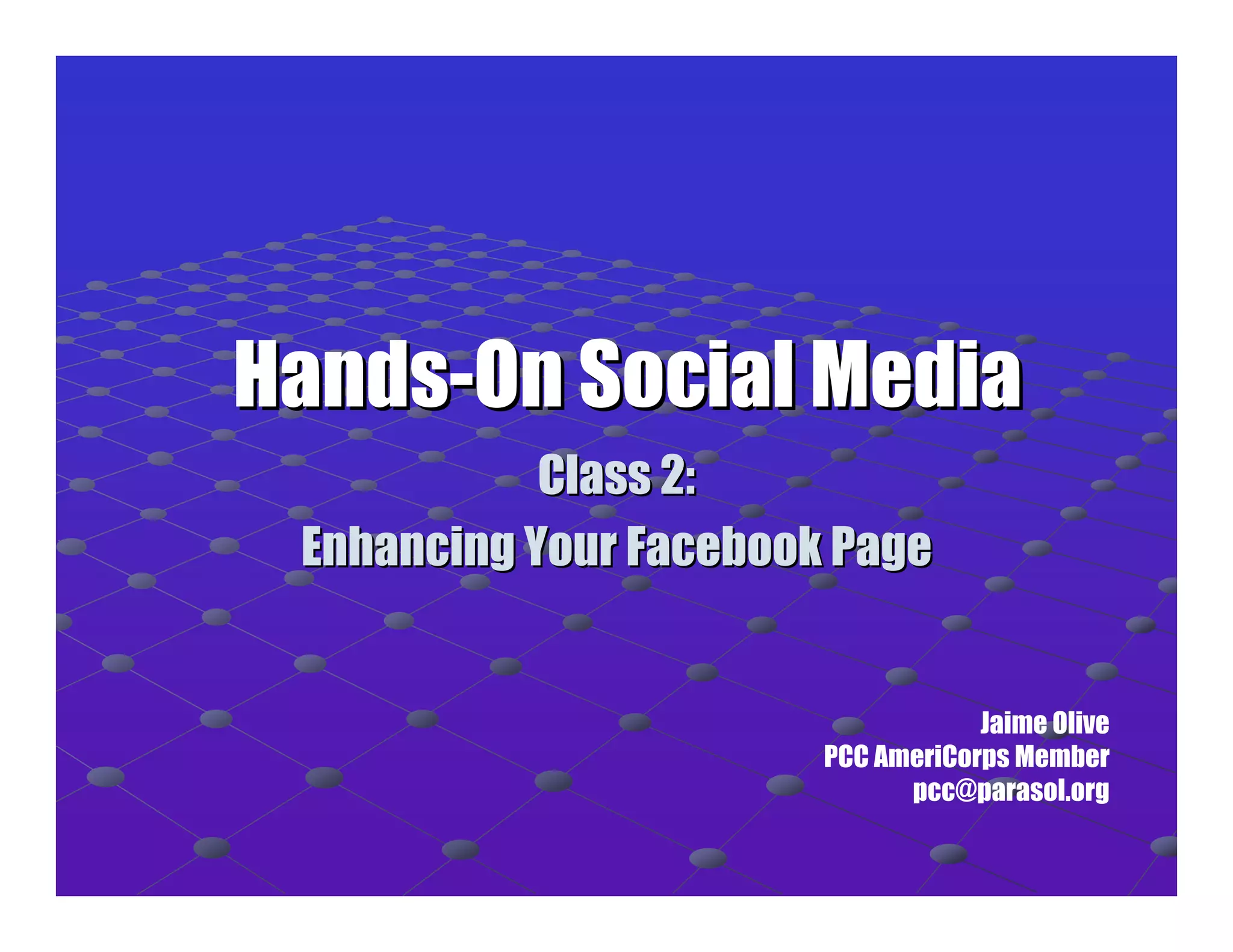 The document is a guide for enhancing Facebook pages through a social media class led by Jaime Olive, focusing on effective engagement and strategy development. It emphasizes the importance of listening, establishing clear objectives, and understanding different Facebook tools, such as profiles, pages, and groups. It also provides practical tips for content creation, audience building, and utilizing various Facebook applications for organizational communication.