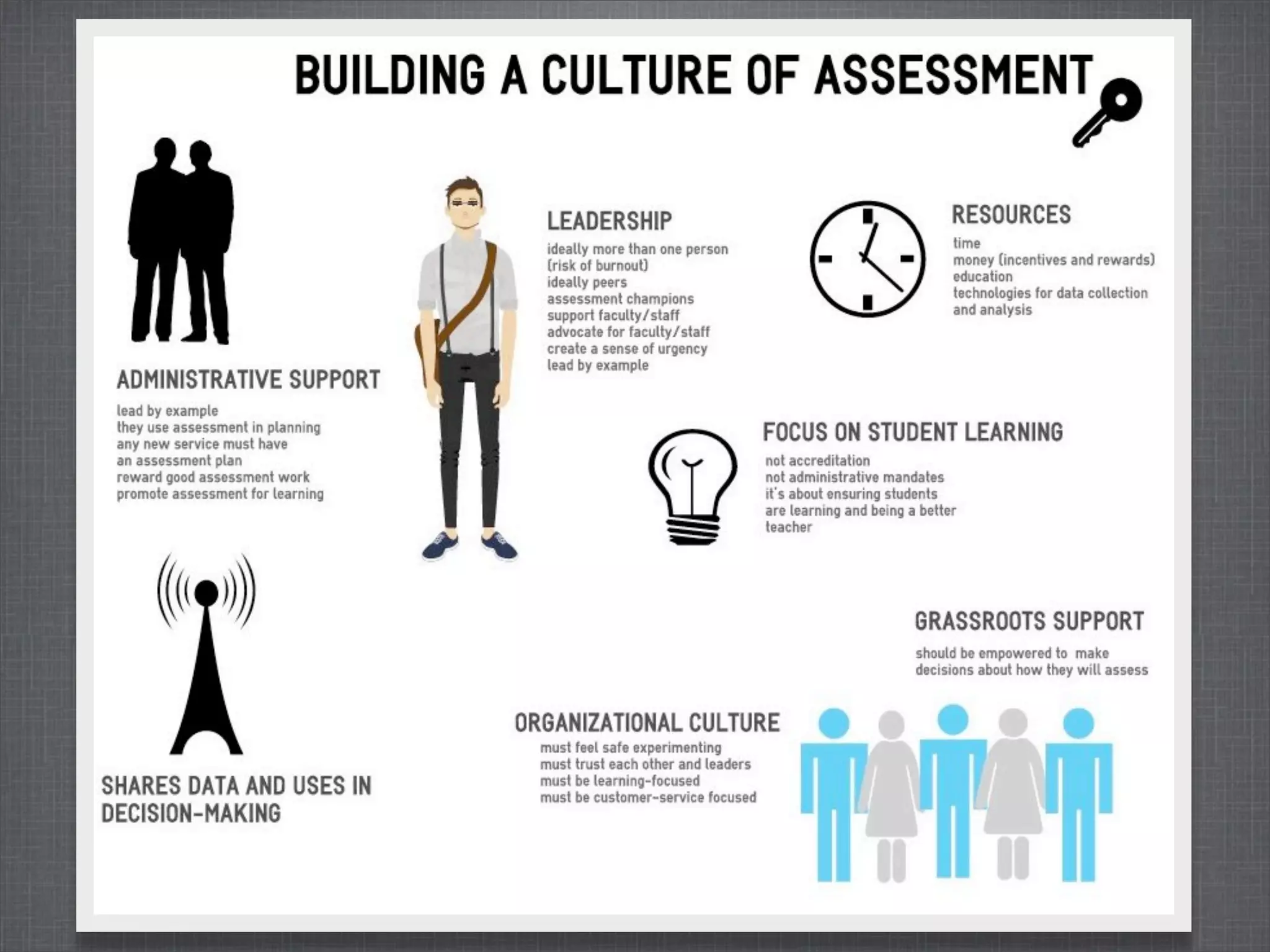 This document discusses building and sustaining a culture of assessment in instruction programs. It defines a culture of assessment as one where assessment is a normal part of practice, done for the right reasons like improving teaching and learning. Building such a culture requires administrative support, resources for staff education and time, and using assessment results to make changes. It also requires addressing staff concerns and overcoming resistance to change. The document provides strategies for implementing assessment at the grassroots level and establishing assessment practices as a core part of the organizational culture.