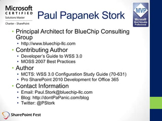Paul Papanek Stork presented on designing and managing extranets in SharePoint 2013 and Office 365. He discussed challenges with on-premise extranets, licensing changes in SharePoint 2013 that made external users free, different Office 365 licensing plans, and how to invite and manage external users. He demonstrated configuring sharing settings and using PowerShell to manage external users.