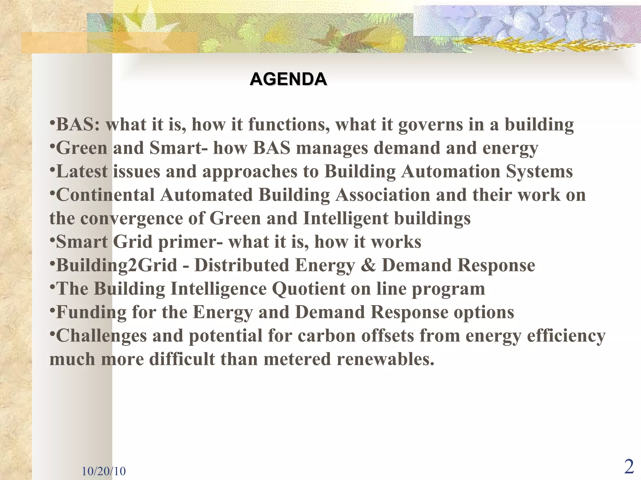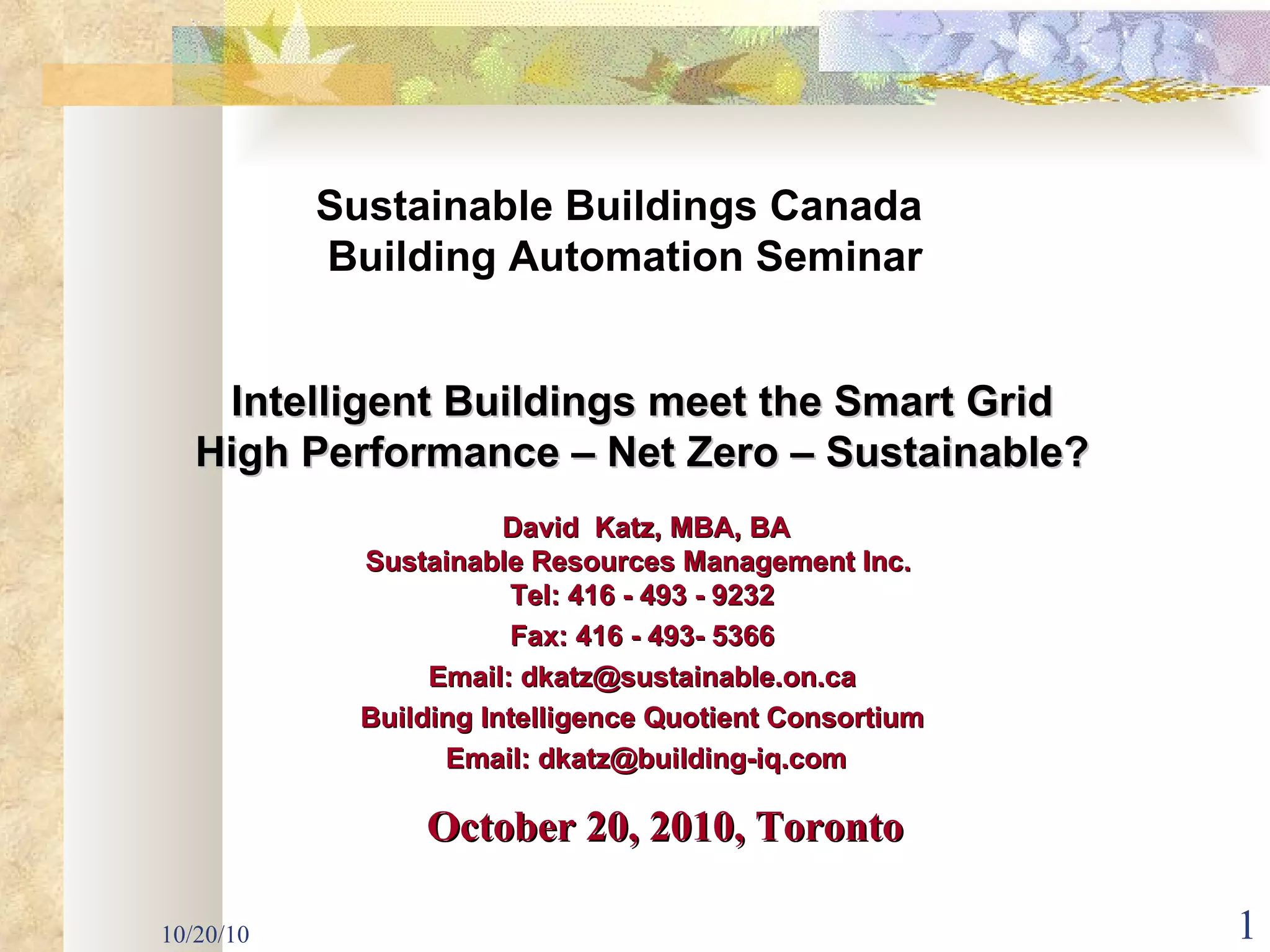 The document discusses the importance of intelligent buildings that integrate advanced technology with sustainable practices to optimize energy efficiency and reduce lifecycle costs. It covers various systems such as building automation, demand response, and the convergence with smart grid technologies, emphasizing the advantages for both operational efficiency and occupant experience. The document also highlights funding opportunities and technological advancements that can enhance building performance while balancing costs and environmental impacts.