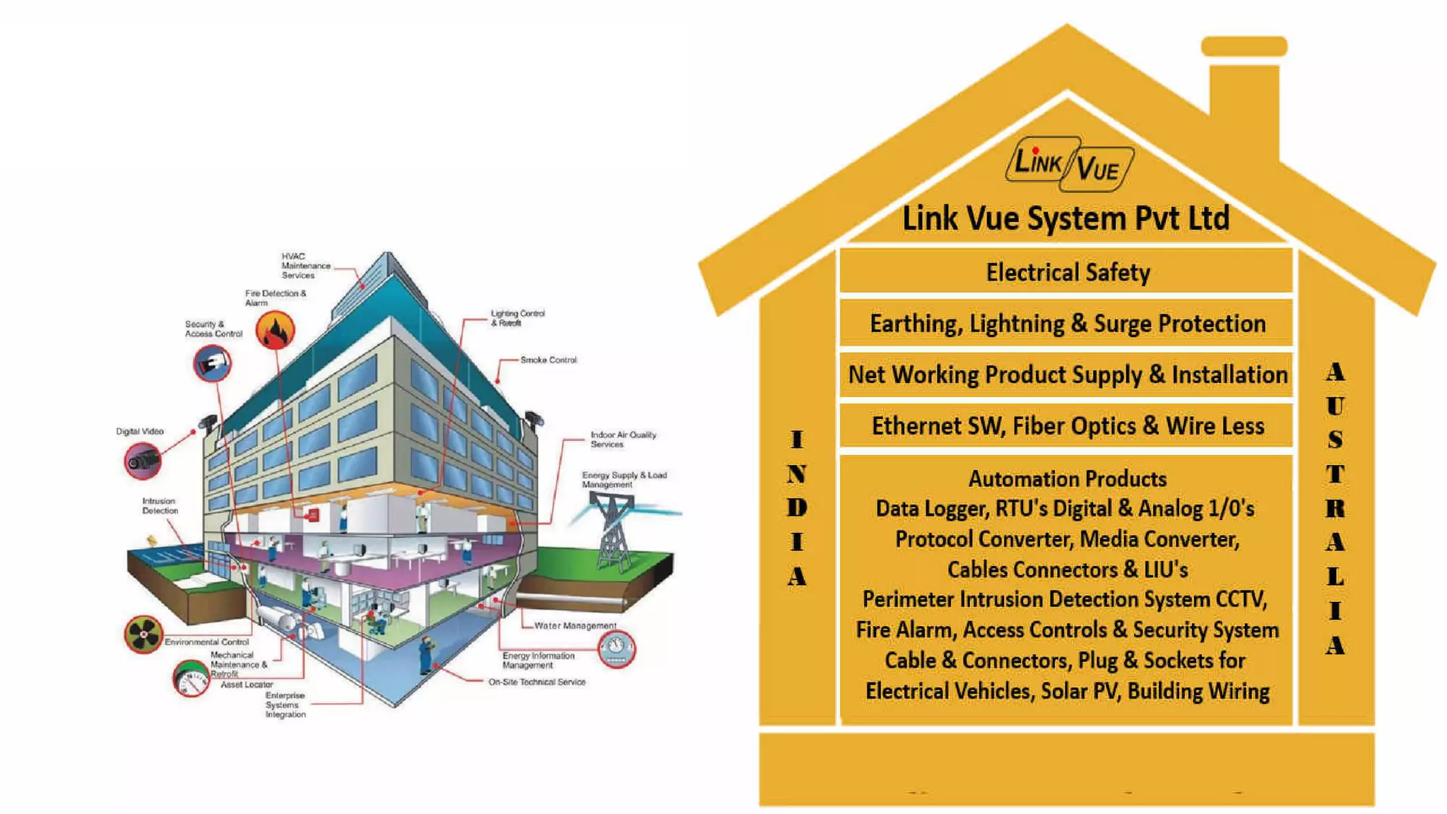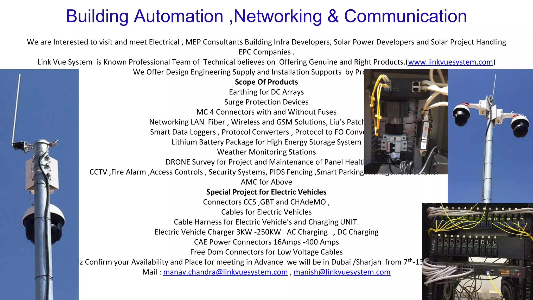 Link Vue System specializes in building automation, electrical consultancy, and security solutions for various sectors including solar power and electric vehicles. The company will be in Dubai/Sharja from February 7-13, 2022, to meet with consultants and EPC companies, offering a range of products and services including surge protection, earthing solutions, and smart data management systems. Additionally, they emphasize the importance of electrical safety and sustainability in modern infrastructure.