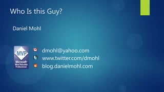 This document discusses building web applications with the F# programming language. It introduces Daniel Mohl as an expert on the topic and provides an overview of why F# is suitable for web development due to its similarities to JavaScript, concise syntax, and features for scalability. The document outlines building an ASP.NET MVC 4 solution in F# and developing a single page application using F# with Backbone.js and other JavaScript libraries.