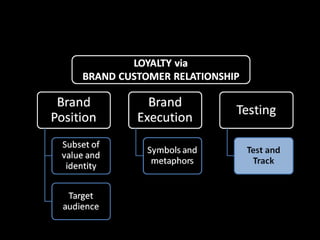 The document discusses strategies for building brand equity in the Japanese luxury menswear market. It recommends conducting a brand audit to define the brand's essence, identity, and positioning. It analyzes opportunities to establish brand equity through improving brand awareness, associations, and loyalty. Key recommendations include focusing digital strategies on localization, content management, and social media to drive awareness and engaging directly with loyal customers. The strategies aim to add brand equity by increasing customer awareness, perceptions of quality, and loyalty to the brand.