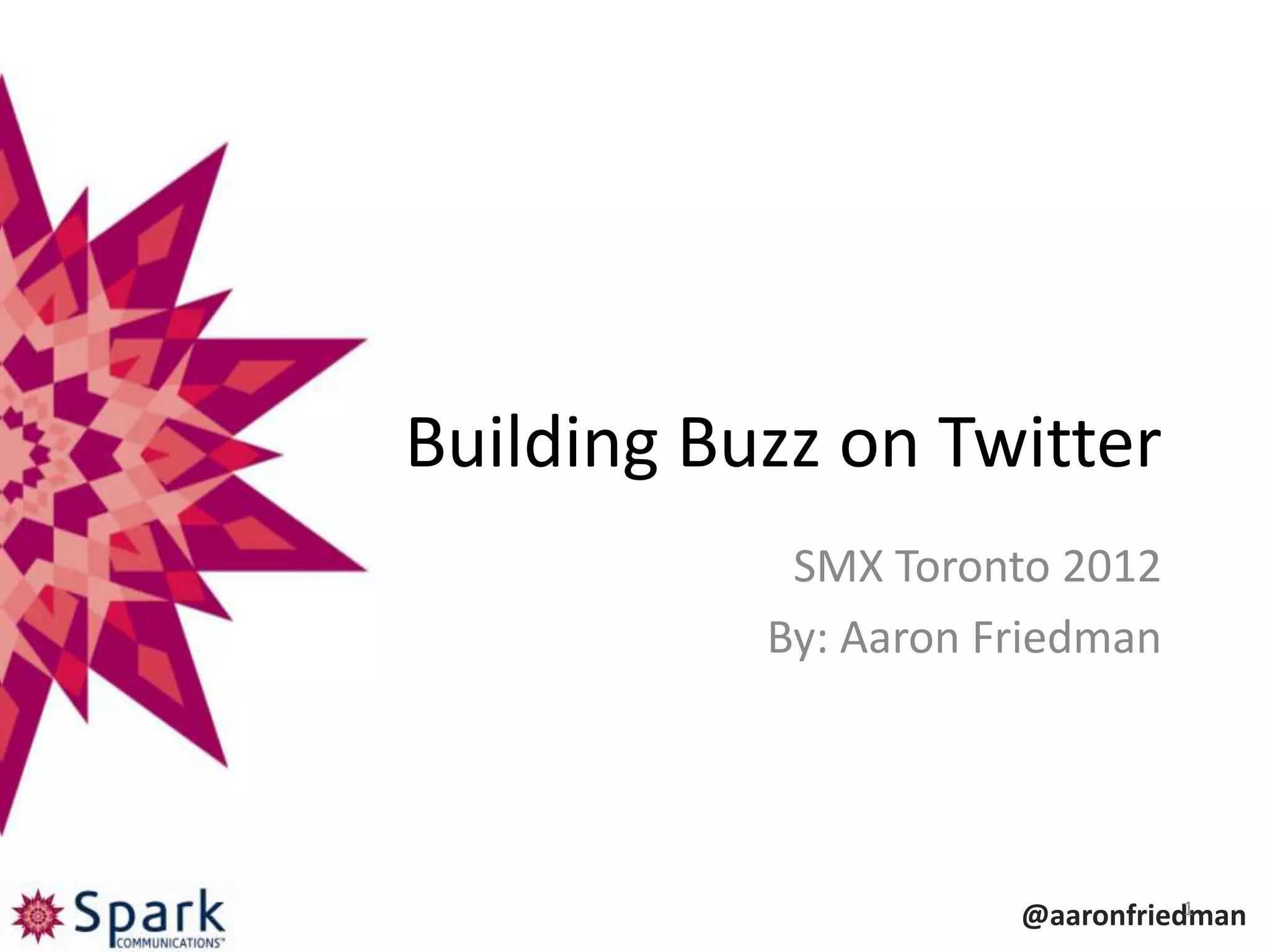 This document summarizes Aaron Friedman's presentation on building buzz on Twitter. The presentation covers how Twitter can be used for communication, fundraising, and business purposes. It also discusses how Twitter contributes to search engines by providing relevant content and how marketers can maximize their Twitter presence to effectively communicate with their audience and ensure their content helps search engines. The key points for successful Twitter use are promoting clarity, simplicity, and incentivizing users or posting timely information.
