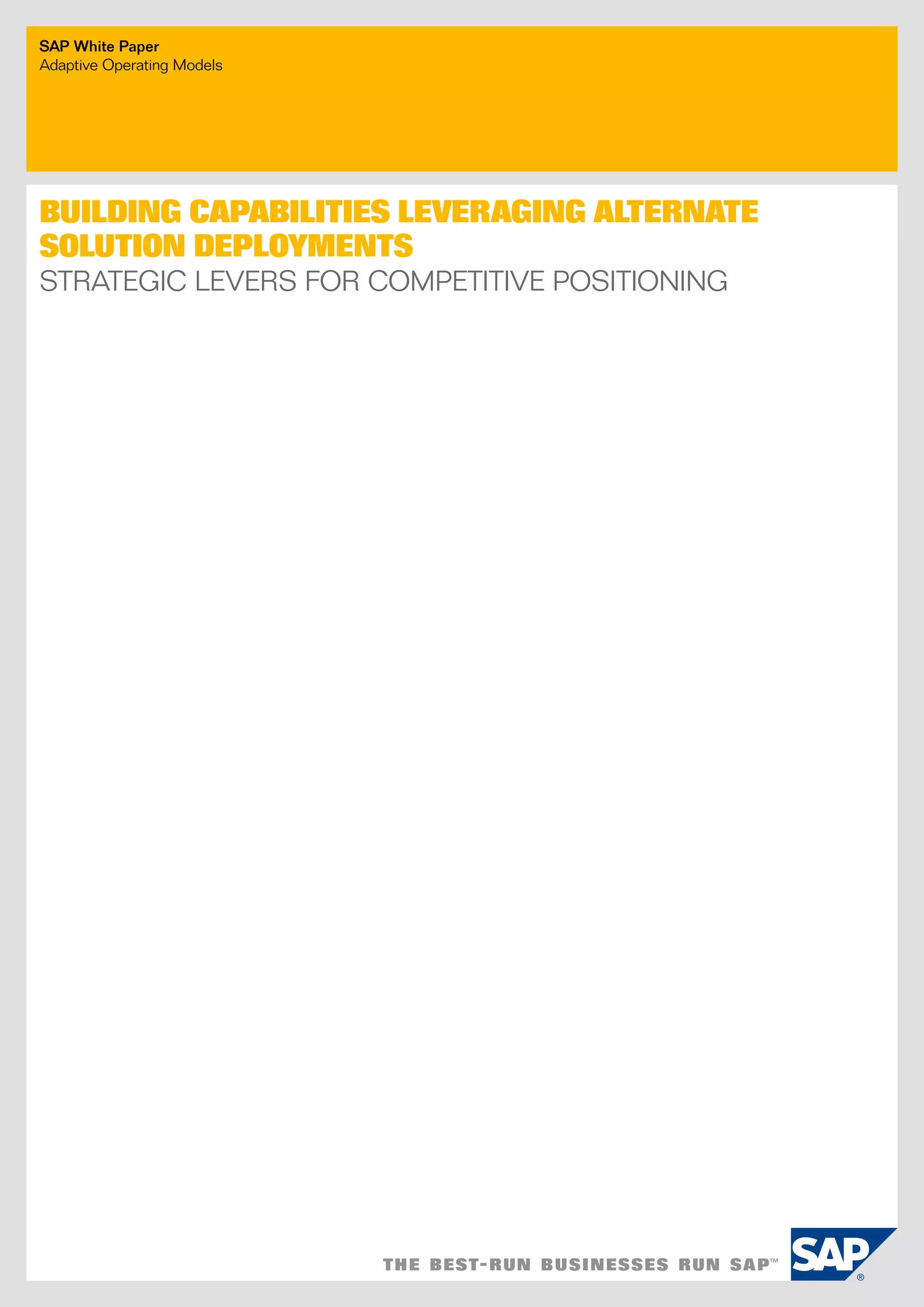 This document discusses strategies for building business capabilities using alternative solution deployment models beyond the traditional in-house approach. It recommends a deliberate design process to architect a best-in-class hybrid solution landscape and operating model. This involves clarity of vision, understanding existing capabilities and options, value-based decision making, and managing the transformation process through collaboration to drive efficiency and achieve strategic goals. Choosing the right combination of on-premise, outsourced, shared services, and on-demand deployment models is key to success.