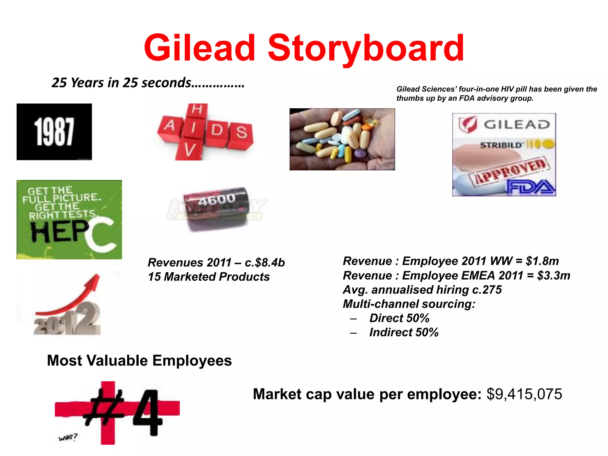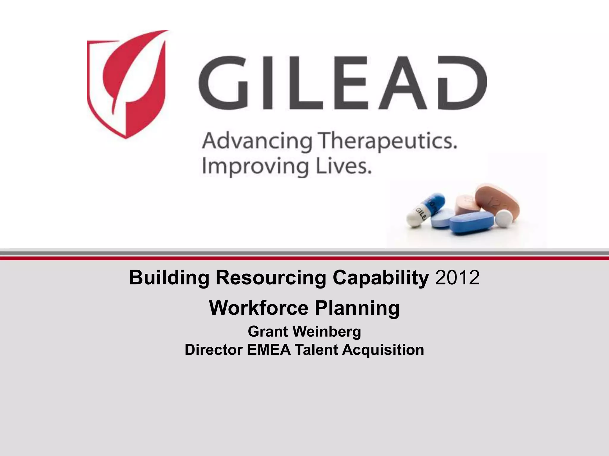 The document details Gilead Sciences' approach to workforce planning, emphasizing the importance of aligning talent acquisition with business objectives and reducing reactive hiring through advanced analytics. It outlines a structured framework for workforce planning, including identifying workforce gaps, managing talent segments, and utilizing strategic tools tailored to organizational needs. Additionally, the document stresses the need for stakeholder education and integration of workforce planning into the overall business process to enhance effectiveness.