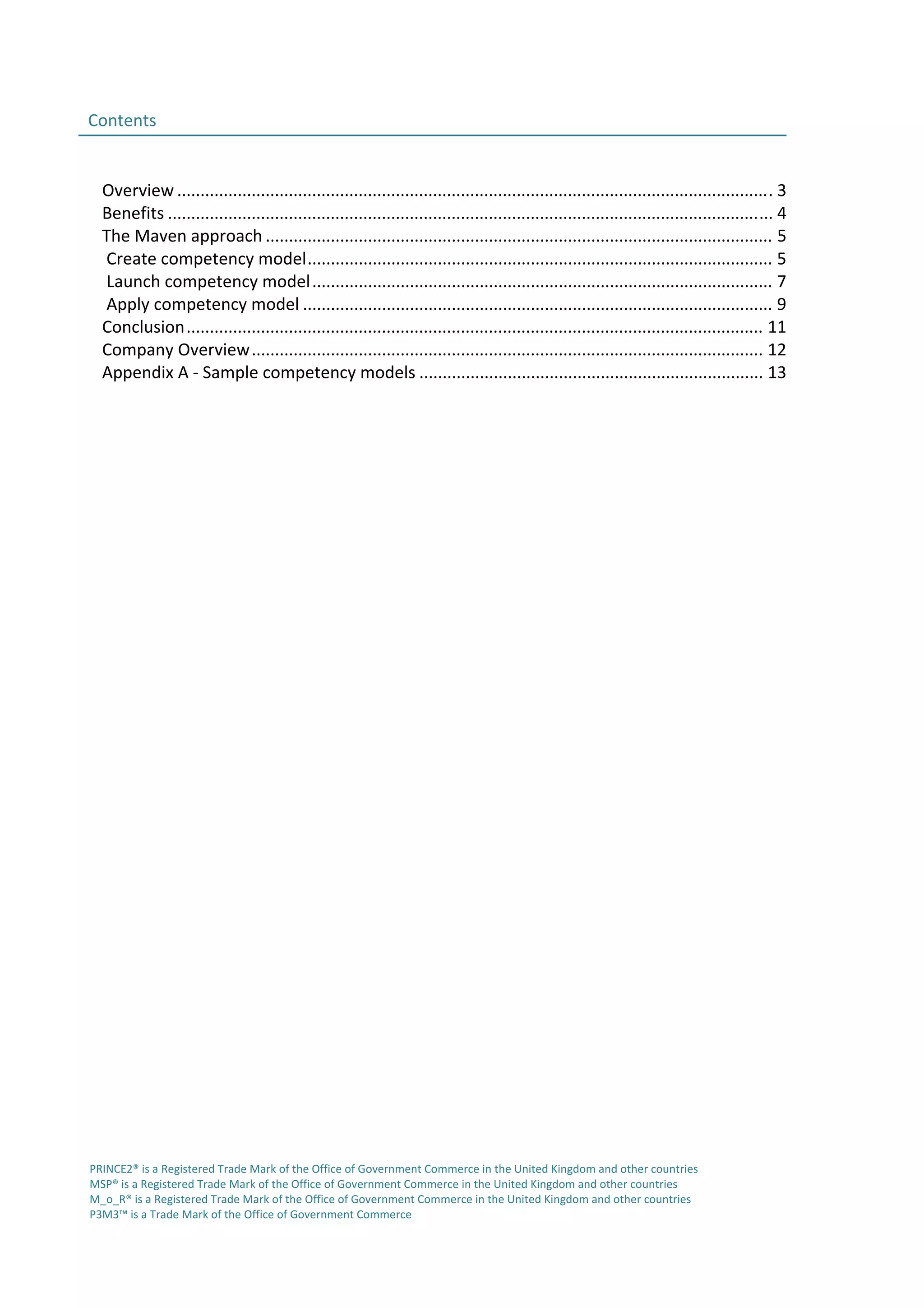This document discusses building project management capability through competency assessments using Maven Training's approach. The three steps in Maven's approach are: 1) Create a competency model by identifying strategic objectives and values, selecting competencies and indicators from best practice models, and mapping competencies to roles. 2) Launch the competency model by generating the model and agreeing assessment levels. 3) Apply the competency model for recruitment, development, and aligning resources to initiatives. Developing a competency model tailored to an organization's culture can provide benefits like improved recruitment, development, and change implementation.