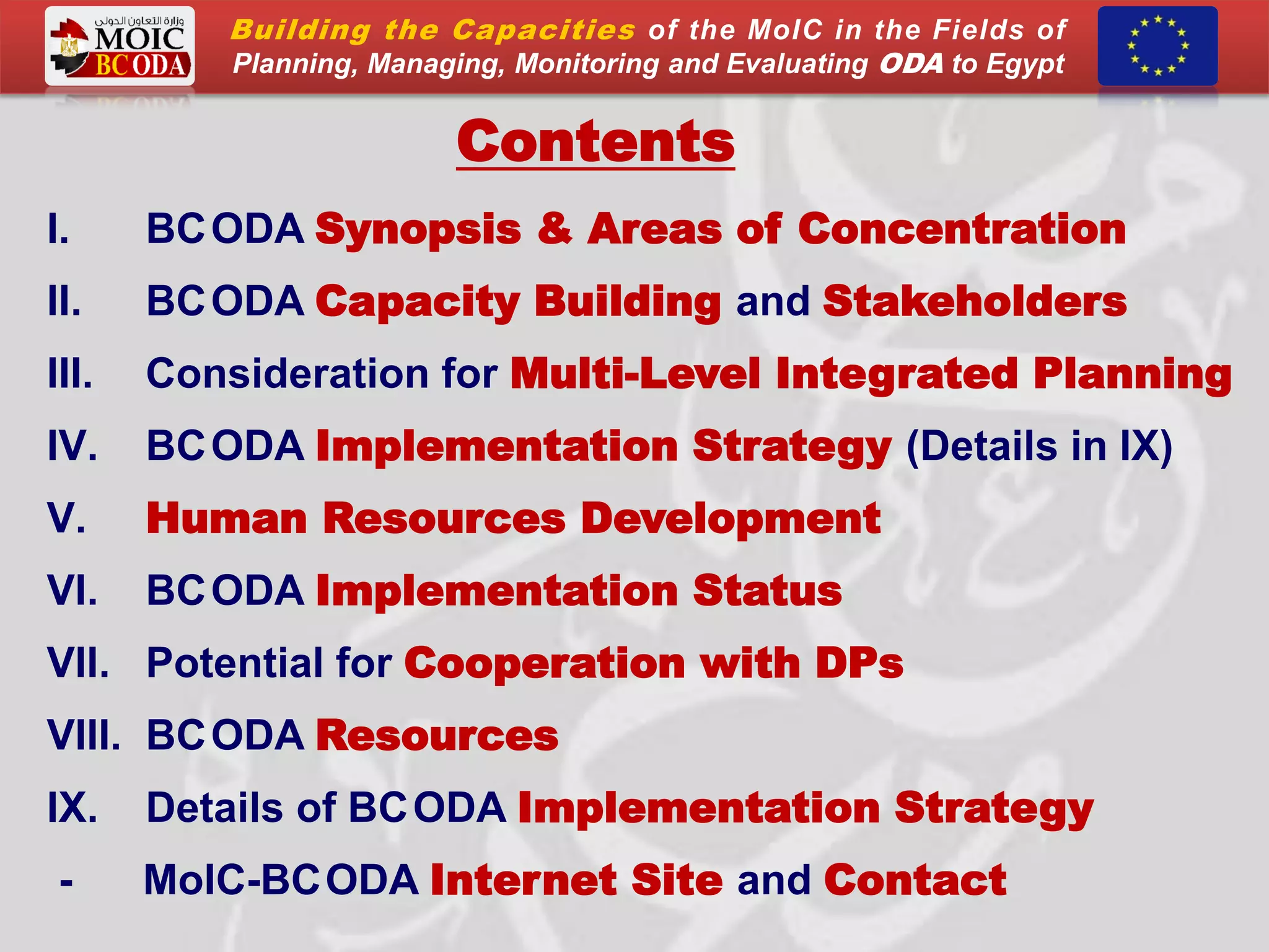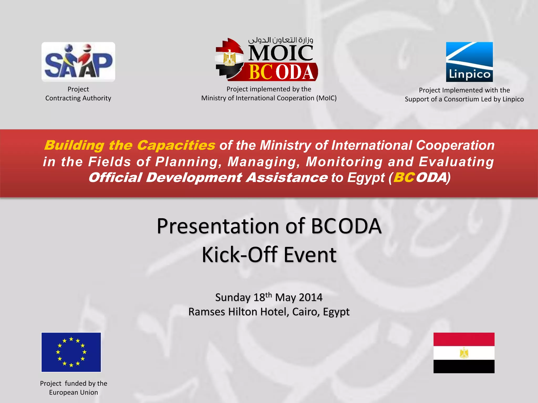 The document describes a project called BCODA that aims to build the capacities of Egypt's Ministry of International Cooperation (MoIC) in planning, managing, monitoring, and evaluating official development assistance (ODA). BCODA will focus on strengthening MoIC's abilities in ODA policy development, strategic planning, information management, monitoring, and evaluation. It will upgrade MoIC's existing ODA database and develop the capacities of MoIC staff over 24 months. BCODA is intended to catalyze sustainable capacity building within MoIC and streamline all such efforts.