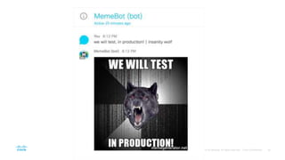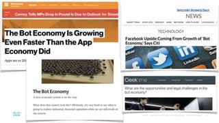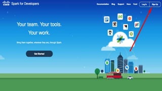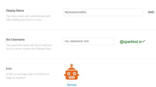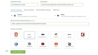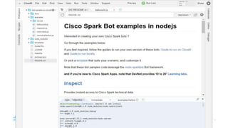 - This document provides instructions for building a basic chat bot using the Cisco Spark API and deploying it on Cloud9. It discusses what chat bots are and their benefits. It then walks through setting up a Cisco Spark account, creating a bot profile, deploying the bot code to Cloud9, adding webhook events to trigger the bot, and testing the bot responses.