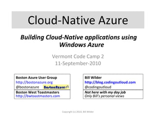 Bill Wilder is a seasoned software developer and founder of the Boston Azure User Group, focusing on cloud computing with a particular interest in Windows Azure. His presentation delves into the advantages of cloud-native applications, the features of Azure's storage services, and the benefits of utilizing cloud infrastructure, including scalability, efficiency, and reduced operational complexity. Wilder also emphasizes the importance of community learning and engagement in the evolution of cloud technologies.