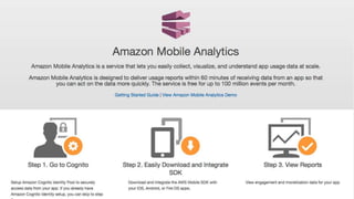 The document discusses building cloud-powered mobile apps using Amazon Web Services (AWS) mobile services. It describes how AWS services like Amazon Cognito, Mobile Analytics, SNS Mobile Push, and connectors can be used for user authentication, data synchronization, analytics, push notifications, and accessing AWS resources from a mobile app. The document provides an overview of the AWS Mobile SDK and how it allows for a unified authentication mechanism across AWS mobile services.