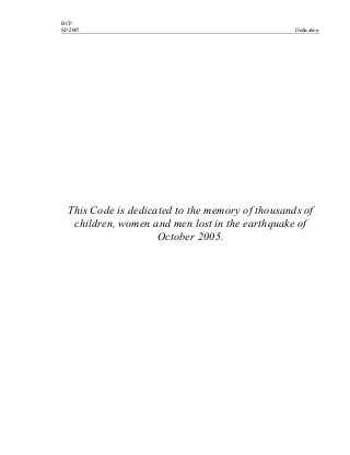 This document is the table of contents for a building code dedicated to victims of an earthquake. It outlines the code's chapters which cover seismic hazard analysis, site considerations, soils and foundations, structural design requirements, structural testing and inspections, structural concrete, and structural steel. The structural design requirements chapter includes divisions on general design, snow loads, wind design, and earthquake design. The earthquake design section specifies requirements for structural analysis, design forces, structural systems, and other seismic design criteria.