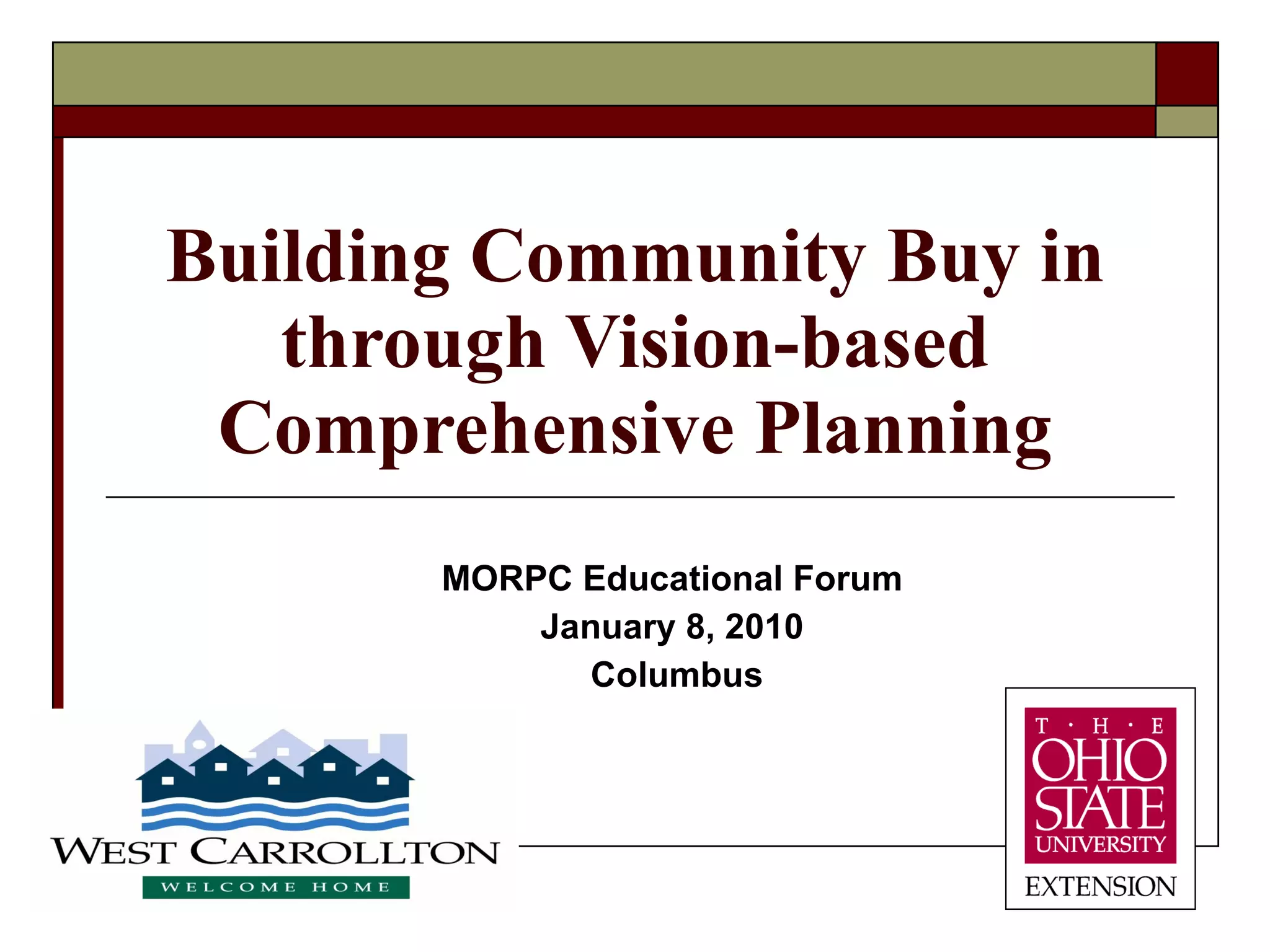 The document discusses a comprehensive planning model used in West Carrollton, Ohio that incorporates sustainability principles. It shares how the city built community support for the plan through an inclusive visioning process. Key elements included forming a diverse steering committee, conducting community workshops to identify shared values and goals, and developing a long-term vision and plan that balanced social, economic and environmental factors. The resulting plan addressed issues like downtown revitalization, economic development, housing, parks and transportation through multi-disciplinary workgroups.