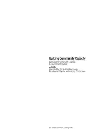 This document provides a guide to resources for community capacity building in Scotland. It defines community capacity building as activities, resources and support that strengthen community skills, abilities and confidence to take effective action. The guide organizes over 40 resources according to an outcomes framework for building capacity. Resources address general topics as well as specific areas like skills development, community influence, organizational effectiveness, planning and inclusion. Community capacity building is seen as important for community engagement and development by empowering communities and groups.