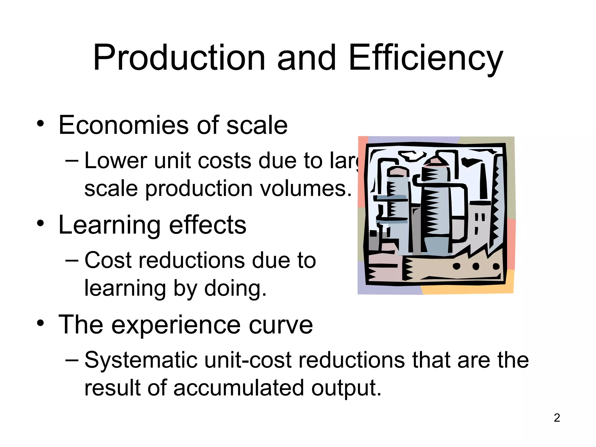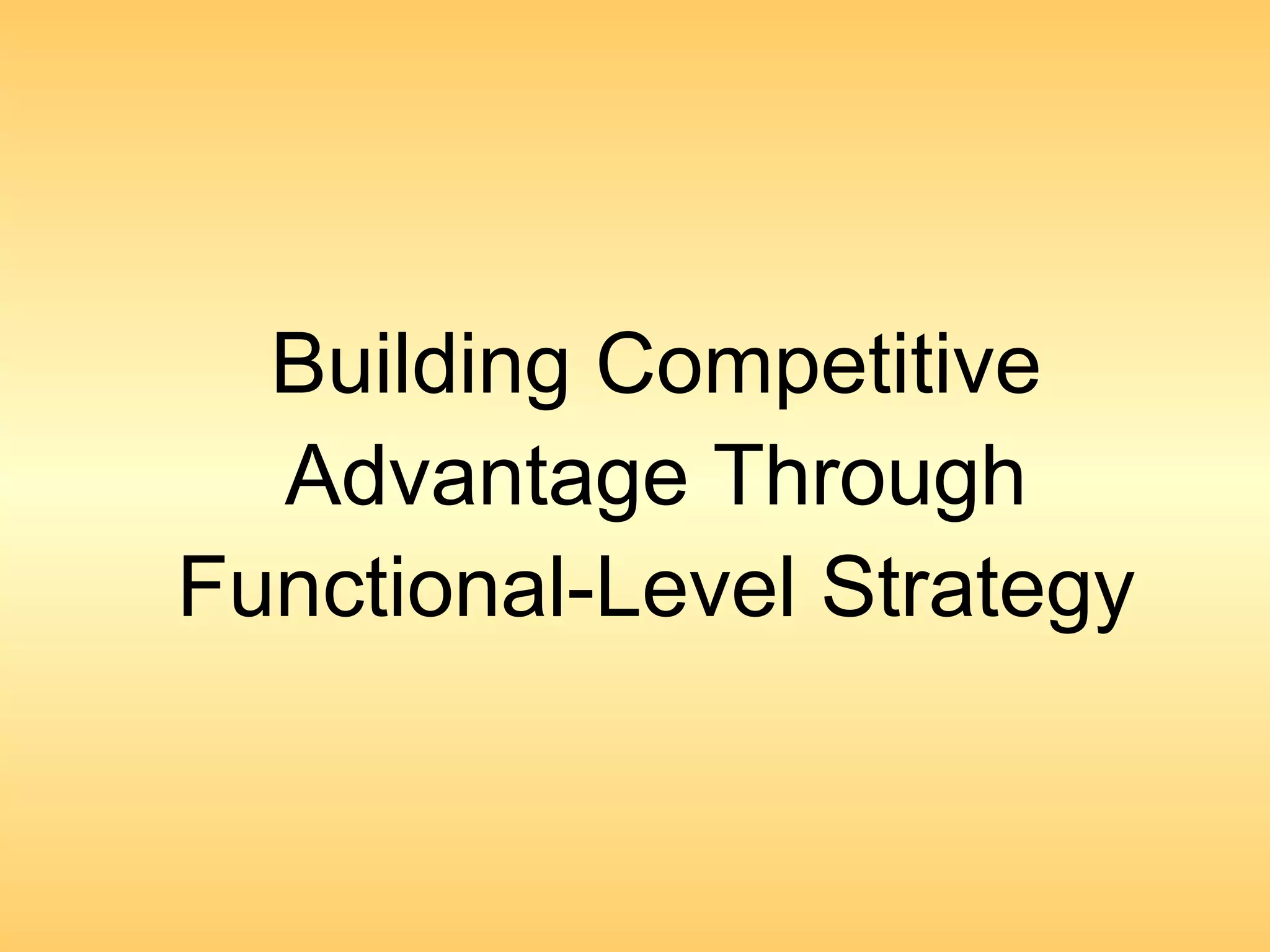 The document discusses strategies for achieving competitive advantage through functional-level strategies in production and efficiency, quality, innovation, and customer responsiveness. It provides figures and tables outlining how functions like human resources, IT, R&D, marketing, and production can work to lower costs, improve quality, drive innovation, and enhance customer service.