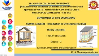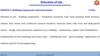 Selection of site – building components – foundation, basement, wall: stone masonry, brick masonry,