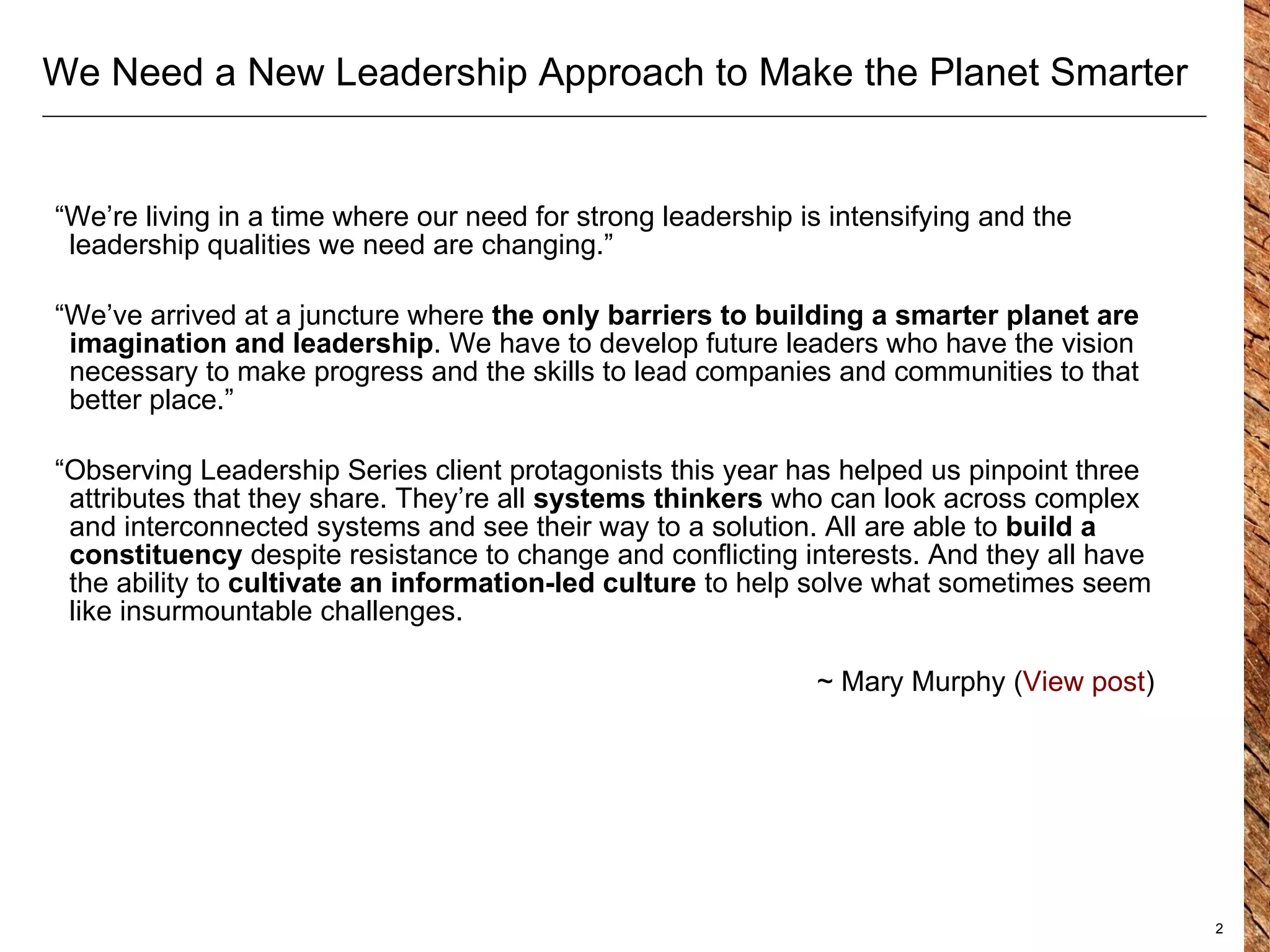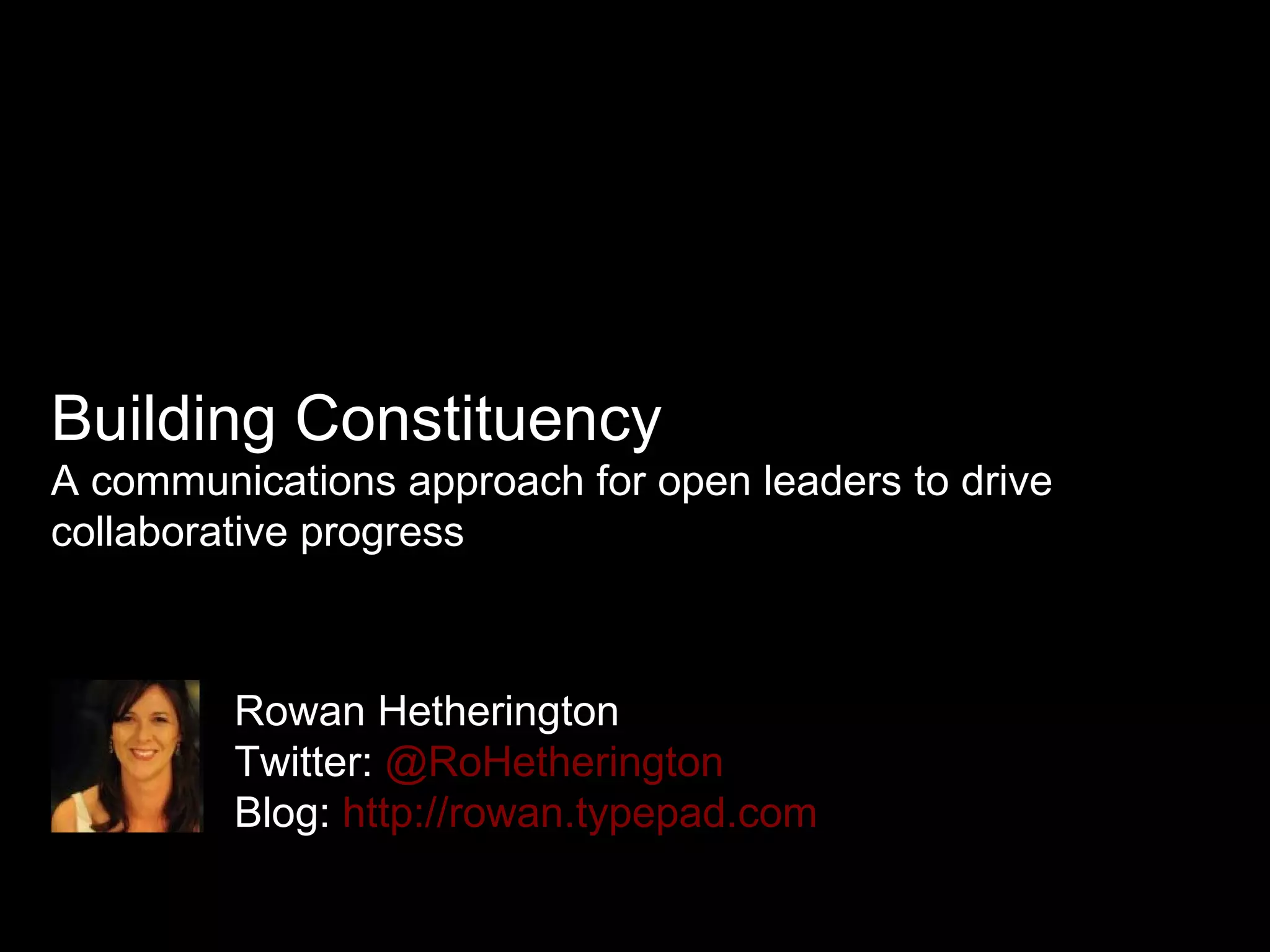 The document discusses building constituency as an important leadership approach for driving collaborative progress. It defines constituency as an activated group with common interests or ambitions that actively opt-in. It then presents a five step approach for leaders to build active constituencies: 1) define the constituency, 2) develop a vision for outcomes and relationship, 3) gather consolidated insights on the constituency, 4) develop integrated communication strategies to engage, energize and embrace the constituency, and 5) iterate based on outcomes, data and learnings. The goal is for leaders to listen to and collaborate with constituents to co-create value.