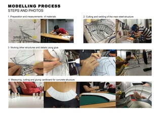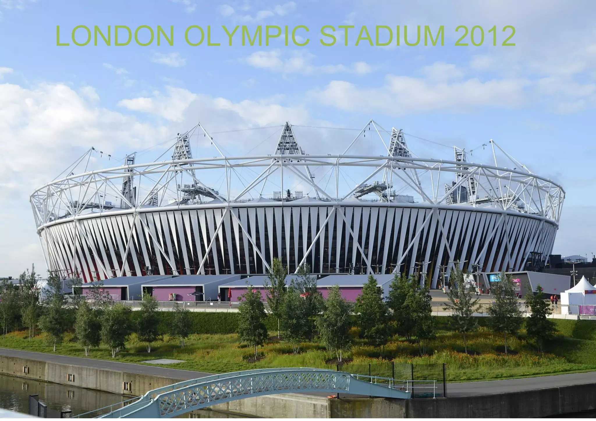 The document discusses the structural systems used in the Olympic Stadium built for the 2012 London Olympics. The stadium features several different structural systems, including a steel skeletal structure, rigid concrete frames with reinforcement, and prefabricated concrete. It also uses external steel bracing and bolted joints between elements. The steel structure supports the cable net roof and transfers loads through the various structural elements to the foundation of 5,000 piles. The document provides details on the different structural components and materials used to construct the lightweight and efficient stadium structure.