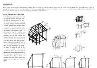 3) The completed shelter used bolts, nuts, brackets and screws to join the timber frame and install a roof made of wood panels and nipah leaves. Testing showed it could withstand heavy rain and support multiple people's weight, demonstrating their understanding of skeletal construction.