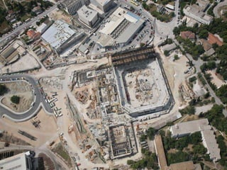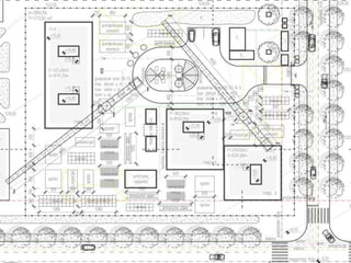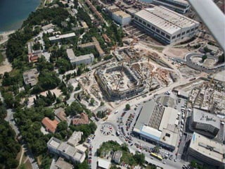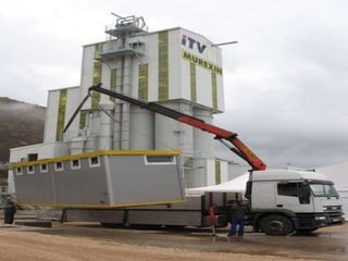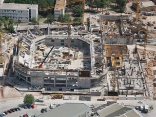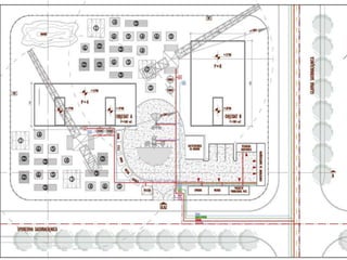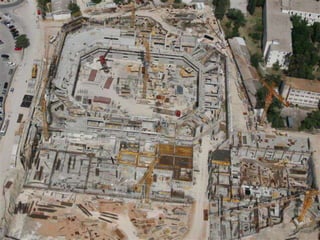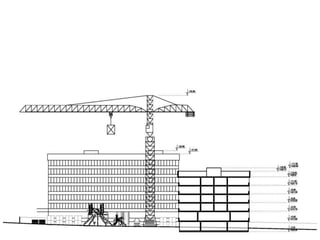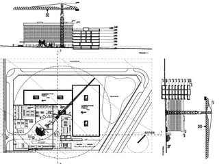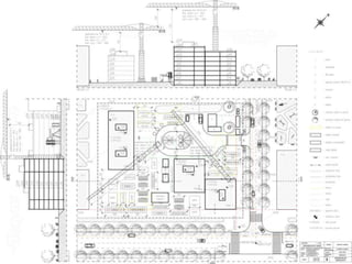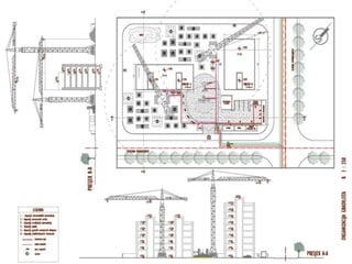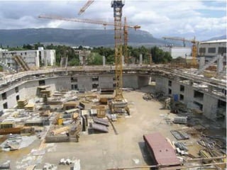 This document provides an overview of construction site organization for a building project. It discusses preparing for the site by collecting technical, geographic, climatic and other relevant data. It describes the initial site work of establishing fences, access roads and excavating foundation pits. The document outlines considerations for on-site logistics like traffic flow, materials storage, temporary buildings and transport of workers, equipment and materials. Proper planning of construction site organization is emphasized as important for efficiency and cost-effectiveness of the building process.