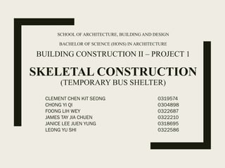 This document describes a project to construct a temporary bus shelter made of bamboo and other recycled materials. It discusses the design process including initial designs, final drawings and photos. The construction process is explained through sequences and progress photos. Key materials used are bamboo for the structure, plywood for subflooring and nipa palm thatching for the roof. Different types of joints and connections used in the structure are illustrated such as notching, nailing and lashing techniques. Load distribution diagrams show how stress is transferred through the curved structure. The conclusion reflects on lessons learned regarding bamboo properties, construction skills and considering strength, stiffness and stability in skeletal structures.