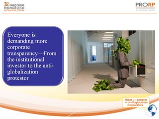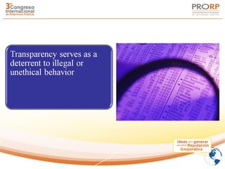 The document discusses building a corporate reputation through transparency. It lists the top 10 best corporate citizens for 2010 according to Corporate Responsibility Magazine, with Hewlett-Packard ranked first. It also lists the 10 worst companies for transparency, with Abercrombie & Fitch ranked lowest. The document outlines key legislation regarding corporate transparency and poses questions for building an open corporate culture with transparency. It provides 10 steps for companies to increase transparency and outlines how employees can contribute.