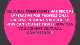 This document outlines 4 ways to build cultural competence through experiential learning: 1) Travel experience provides exposure to new cultures, 2) Work experience such as international internships allows immersion in foreign business environments, 3) Academic experience like study abroad programs gives perspectives on other educational systems, and 4) Volunteer experience abroad helps understand different cultures while contributing to communities. Cultural competence is important for professional success globally.