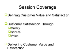 The document discusses building customer satisfaction through delivering value and high quality. It defines customer value and satisfaction, and how perceived value is determined by benefits versus costs. Specific strategies are provided, such as enhancing product attributes, improving quality, reducing prices, and focusing on customer service. Measuring satisfaction through surveys and monitoring complaints is also covered. The goal is to turn customers into loyal, long-term partners by continuously discovering ways to provide more value.