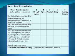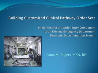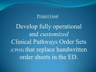 The document outlines the development and implementation of customized Clinical Pathway Order Sets (CPOS) to replace handwritten orders in the emergency department, addressing issues of medical errors and communication inefficiencies. Project objectives included building CPOS based on best practices, training end users, and evaluating acceptance through surveys, which revealed mixed feelings about the usefulness of the order sets among nursing staff. Although training ratings were generally positive, concerns about the order sets being primarily for physicians could hinder their successful adoption.